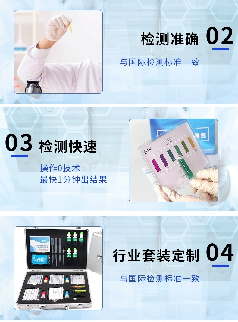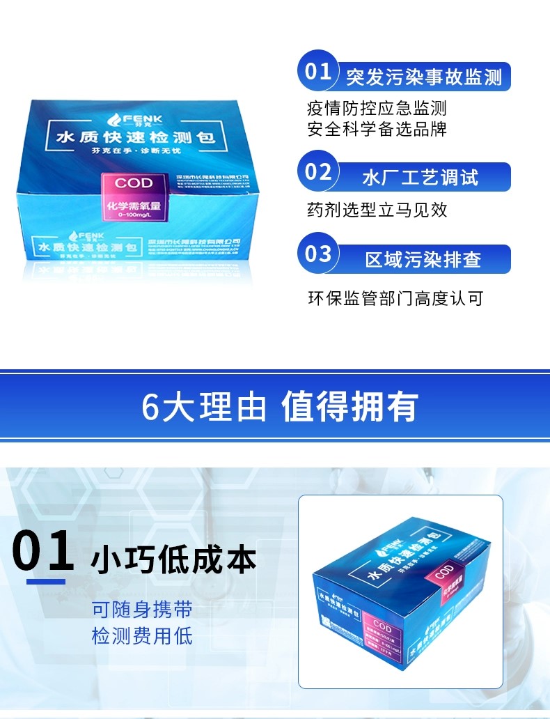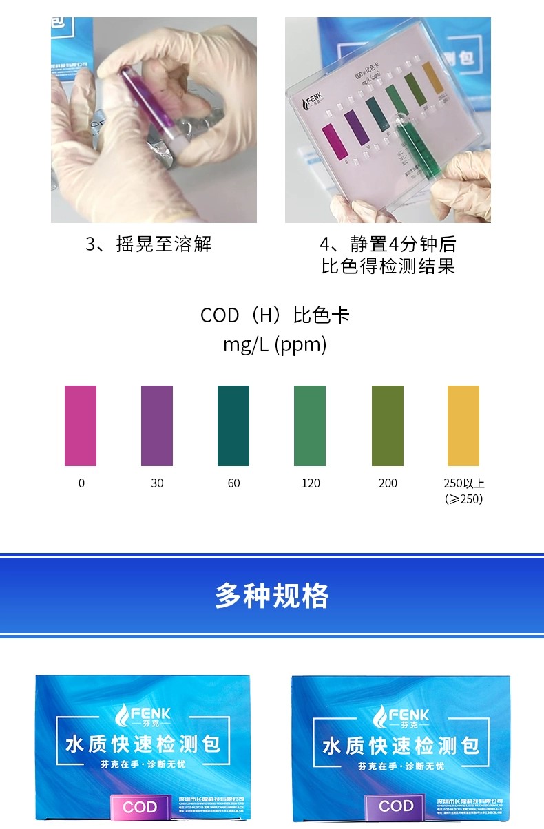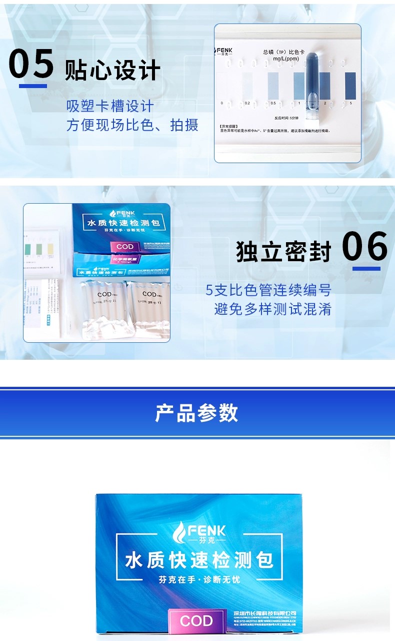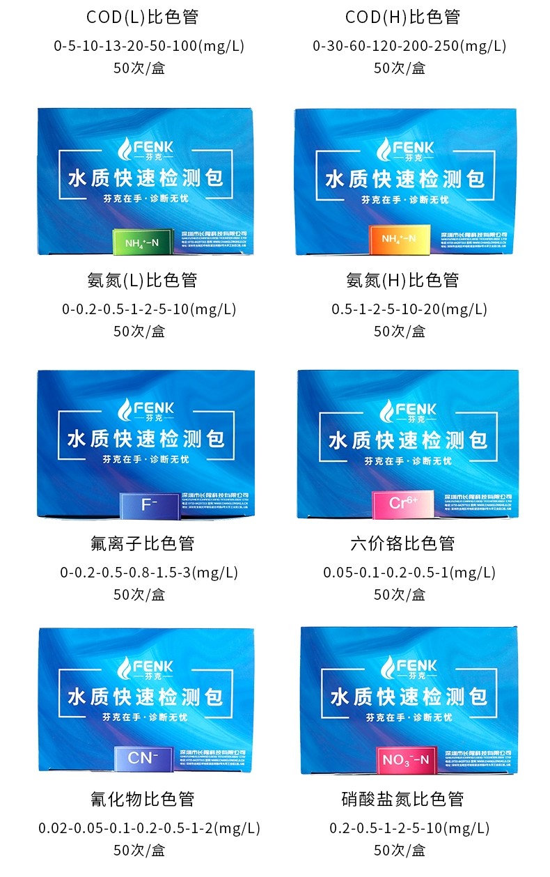 產(chǎn)品簡(jiǎn)介:芬克水質(zhì)快速檢測(cè):批量式樣品檢測(cè),快至1分鐘。準(zhǔn)確:依據(jù)國(guó)標(biāo)方法開發(fā)強(qiáng)抗干擾試劑,申請(qǐng)專利保護(hù)。便攜:比色管獨(dú)立包裝,可放進(jìn)口袋。