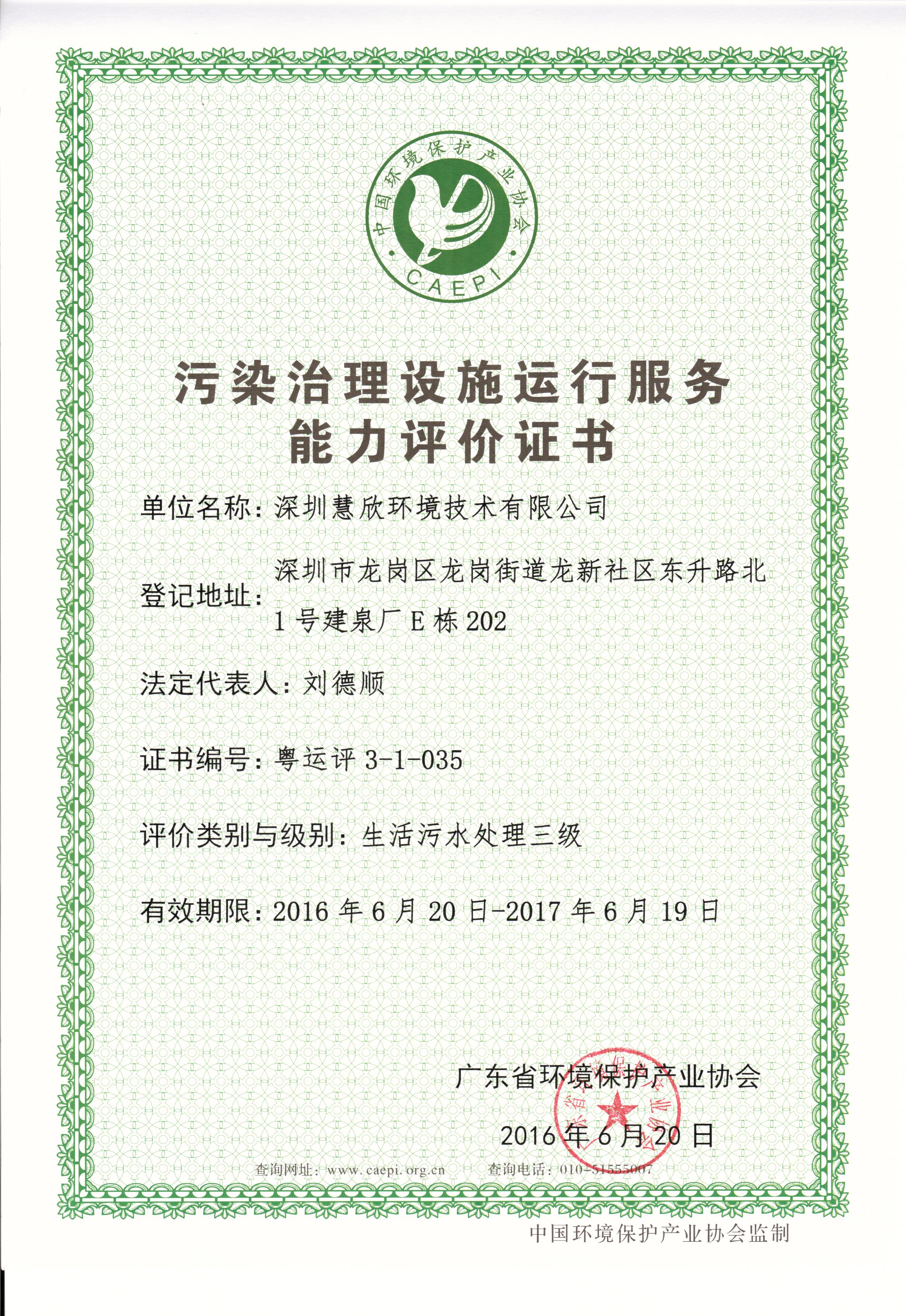 經(jīng)廣東省污染治理設(shè)施運(yùn)行服務(wù)能力評價(jià)委員會(huì)會(huì)議審定及公示無異議后,批準(zhǔn)35家單位為2016年第一批廣東省污染治理設(shè)施運(yùn)行服務(wù)能力評價(jià)證書獲證單位,我公司子公司慧欣環(huán)境名列其中,獲得生活污水三級、工業(yè)廢水三級證書。